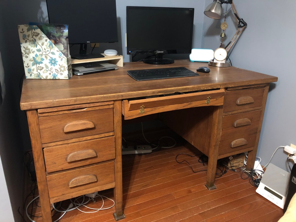 My husband basically sat the desk up in the garage and gave me paint or varnish stripper. I had no idea what I was doing, but he showed me how to apply it, wait a bit, and then strip the old paint and varnish with a scraper. This process went on and on for days, maybe even weeks. The desk is very large and I had to also do all the drawer fronts. The top, with its water stains and cigarette burns needed multiple coats of varnish remover. While I was working on this, we decided we needed to have someone build a front middle drawer to complete the look of the desk. We took what we could to a local antique dealer and he gave us a name of someone who would build an oak drawer to match. (Many years later I would have my dad cut into this middle drawer so I could install hinges to allow the drawer front to open. This allowed me to place a computer keyboard there and use it as a pull out so it was more ergonomically friendly.)